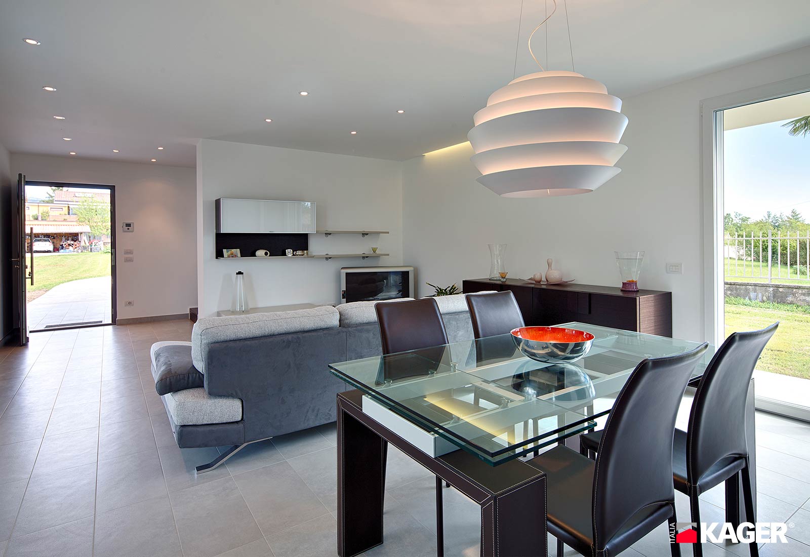Si generano così terrazzi, balconi, sporti e porticati, tutti argomenti appartenenti all’architettura classica residenziale ma declinati in una nuova veste formale. La luce, attraverso le ombre, modella le forme esterne durante il giorno dando enfasi all’articolazione volumetrica, mentre all’interno le ampie vetrate permettono un rapporto diretto con il giardino privato.